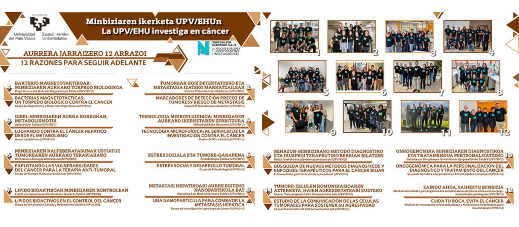 La Universidad del País Vasco ha preparado la exposición ‘La UPV/EHU investiga en cáncer’, una actividad que ese enmarca en la campaña de sensibilización que el Grupo 9 Universidades ha puesto en marcha, dentro del proyecto G9Missions de la Noche de los Investigadores e Investigadoras, para reivindicar el papel de la investigación en la lucha contra el cáncer.