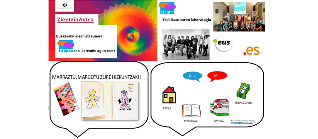 El objetivo de este stand es que los y las participantes reflexionen sobre el lenguaje y el bilingüismo, asumiendo el rol de investigadores e investigadoras, y experimentando directamente con algunos temas de investigación del laboratorio ELEBILAB. De hecho, en este txoko haremos juegos con algunos de los temas que se tratan en el grupo de investigación Elebilab de la EHU, y así ilustrar la investigación que se hace sobre ellos.